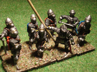 En réalité, il s'agit de chevaliers démontés, fabriqués par Essex à l'échelle du 25mm. Ils sont très, très lents sur le champ de bataille, mais une fois arrivés au contact des piétons ennemis, ils se révèlent redoutables. Enfin, un chevalier, c'est tout de même fait pour aller à cheval...