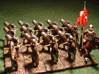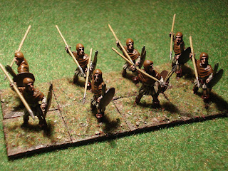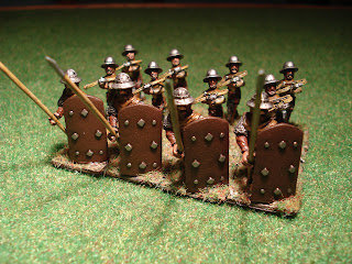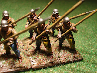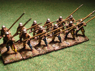 Sur la table, cette unité de lanciers équipés de longues lances, ne possède ni bouclier, ni pavois. Ainsi formé, elle résistera parfaitement, de front, à toutes sortes de troupes. Les figurines sont de robustes 28mm de la marque Grenadier, choisies pour représenter la robustesse des hommes de cette région de Montagne. Je précise, avant de vous livrer les photos, que l'unité est peinte aux couleurs du Dauphiné.