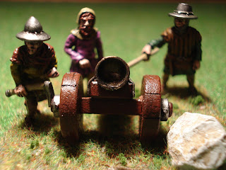Afin de représenter ces troupes, j'ai choisi deux bombardes de chez Hinchliffe models (qui a toujours très bien réussi les modèles d'artillerie, notamment), servies par des artilleurs de chez Essex miniatures et un capitaine d'artillerie de chez Ral Partha ; à vous de le retrouver sur les photos ;-)