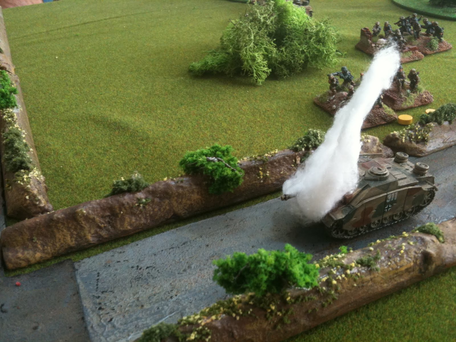 L'assaut blindé des sturmgeschütz est rapidement freiné par les piat de l'infanterie anglaise, arrêtant deux blindés sur l'aile gauche du dispositif allemand. Par ailleurs, les tirs ajustés des canons antichars de 6 pouces, dont l'un barre la route principale,  réussissent à détruire deux blindés, l'un sur la route, l'autre sur l'aile droite allemande.