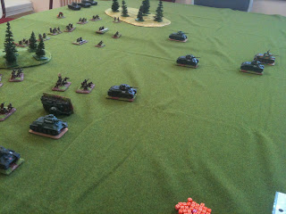 Afin de mener l'assaut, les russes disposaient d'une compagnie bindée de la Garde, essentiellement composée de T34/85, accompagnée d'une compagnie d'infanterie. Le tout était soutenu par de l'artillerie hors carte (une batterie de mortiers lourds de 120mm) et de l'artillerie sur table (un peloton de KV2, survivance du début de la guerre). Ceux-ci seront d'ailleurs soumis à une carte "Breakdown", symbolisant les pannes récurrentes de ces mastodontes au canon de 152mm.