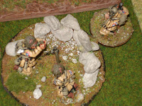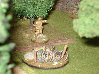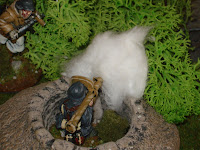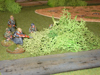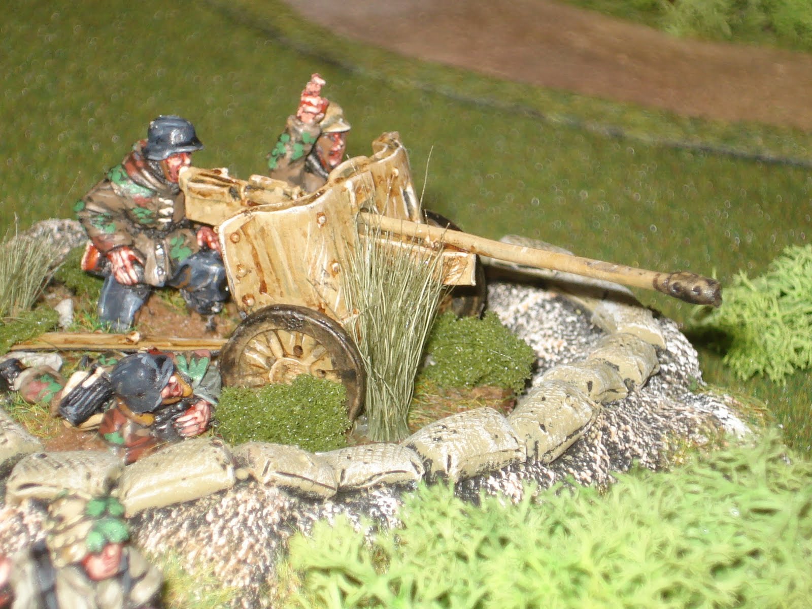 En première ligne au delà du cours d'eau, abrités dans des trous d'hommes derrière des brousailles, se trouvent l'équipe de casseurs de chars ainsi qu'un squad de grenadiers ; ce sont eux qui ouvriront le feu.