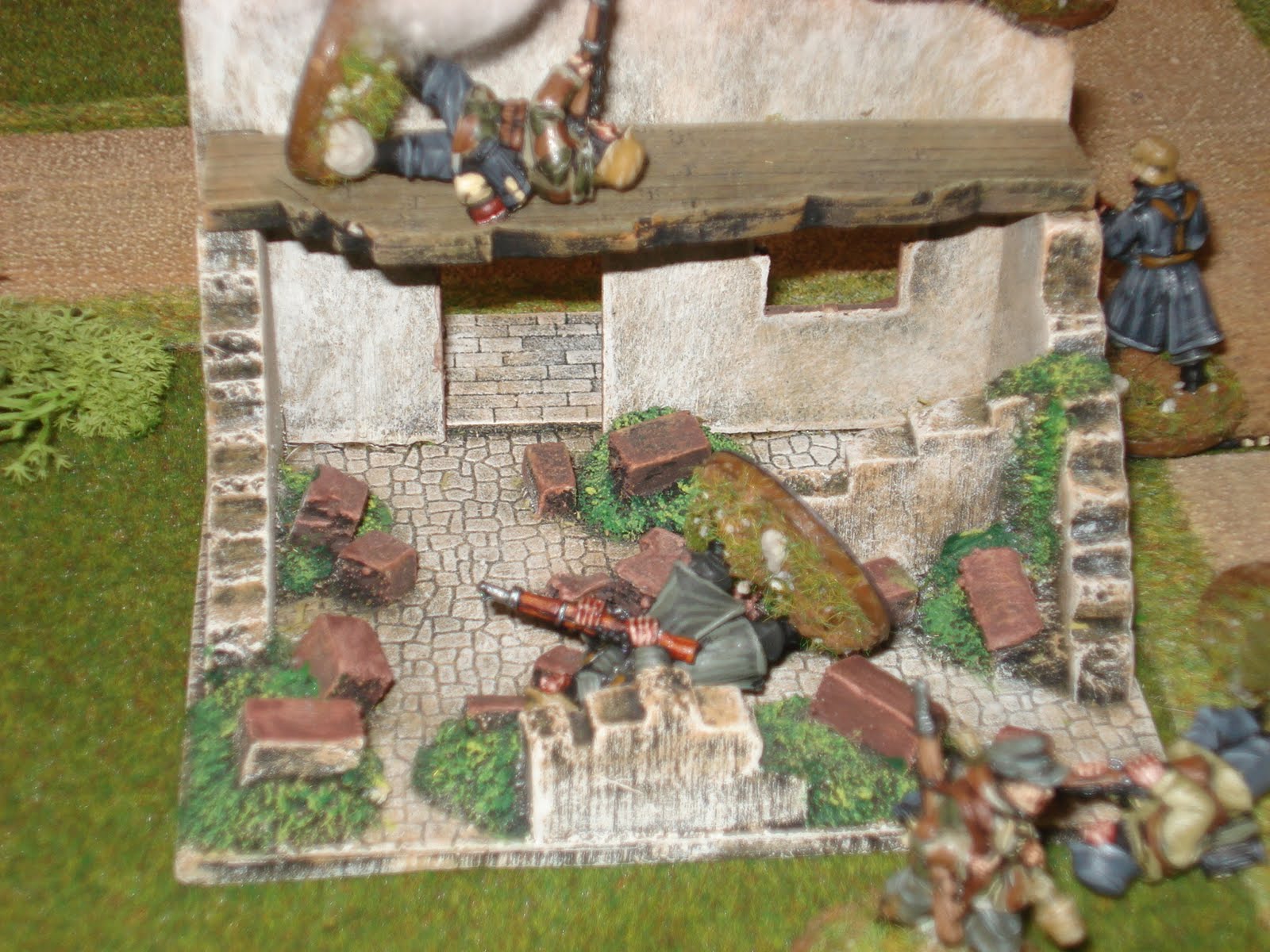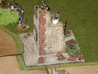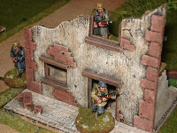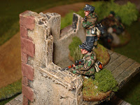 Puis en deuxième ligne, s'appuyant sur les ruines de quelques bâtiments ayant subi, préalablement à la bataille, des feux d'artillerie, se trouve le véritable rideau défensif du dispostif allemand.