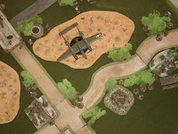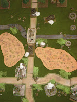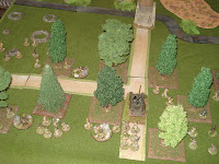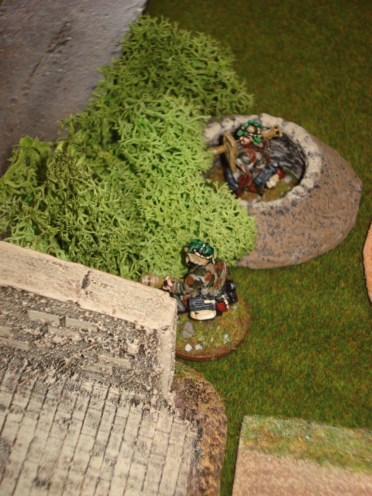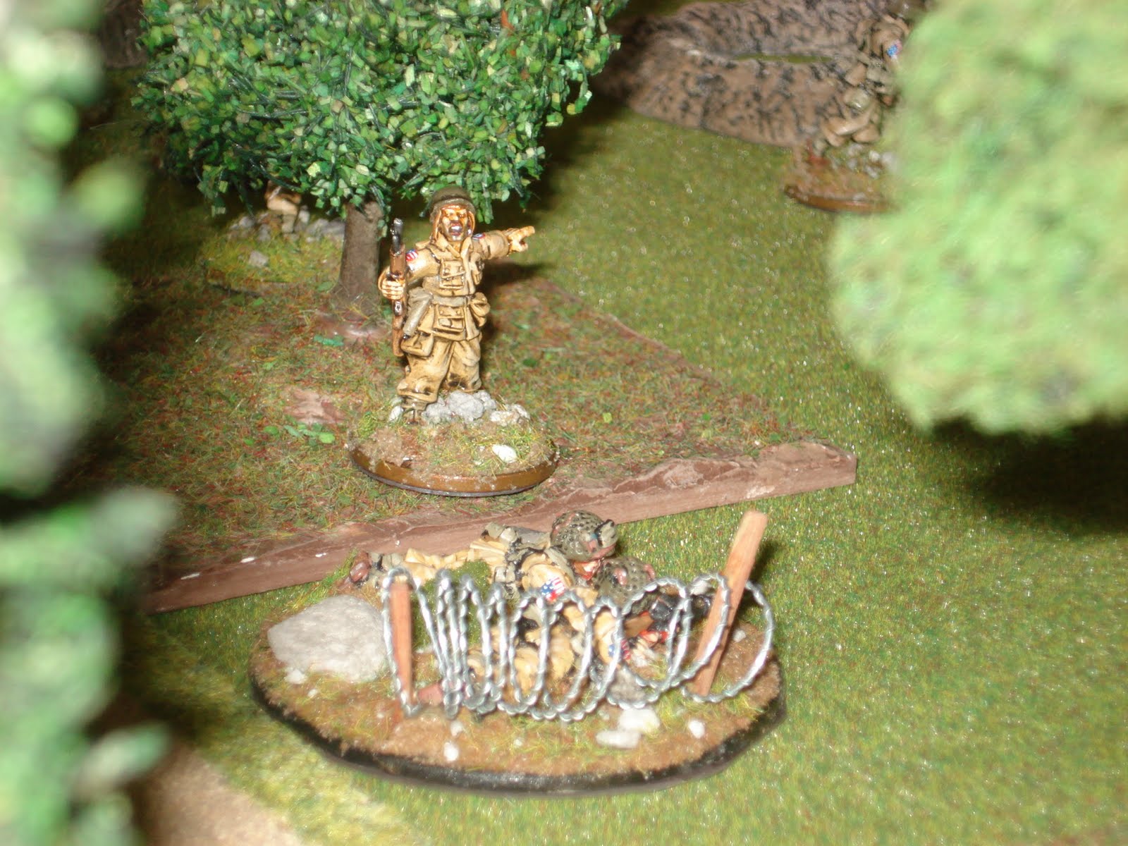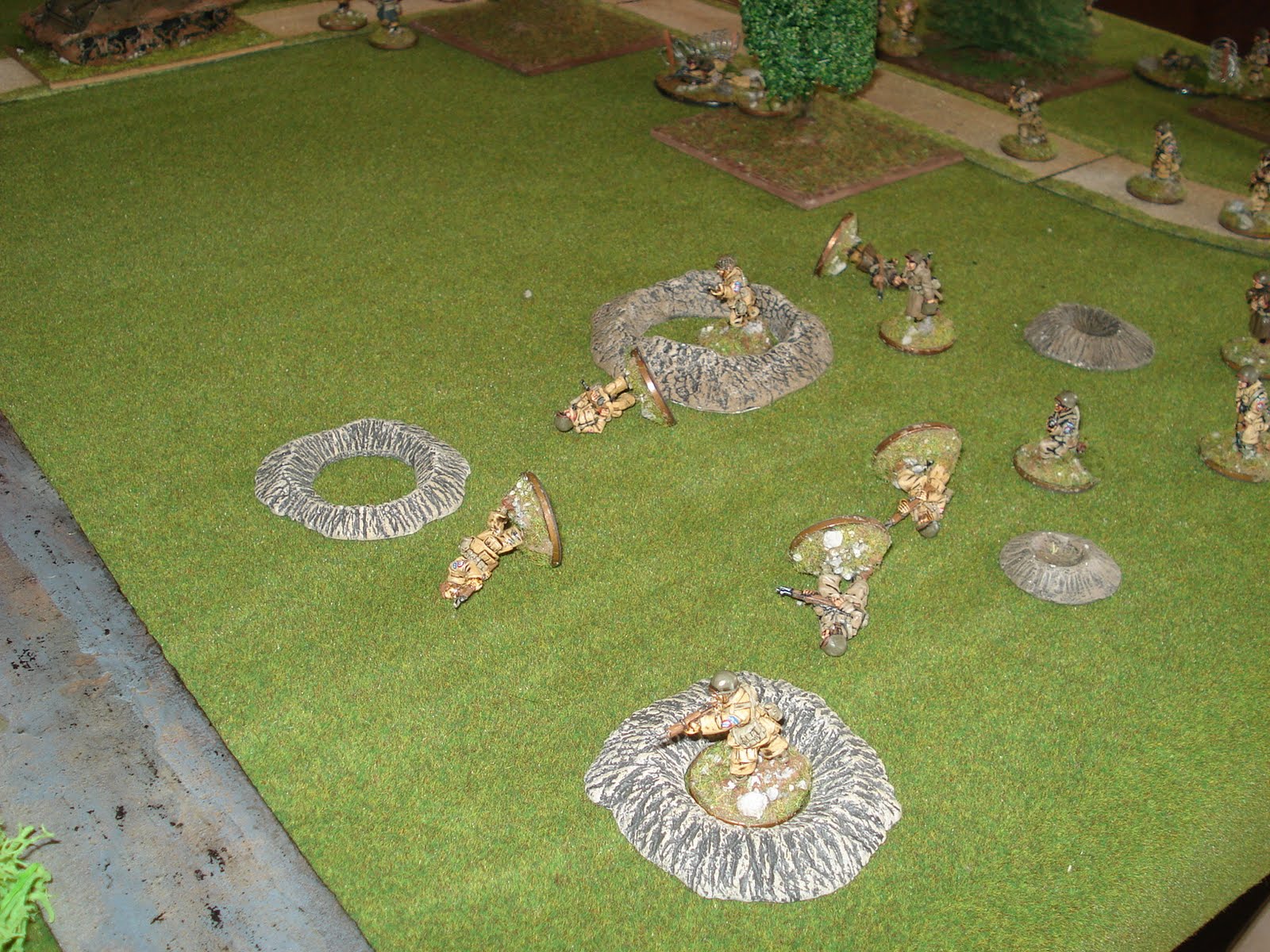 Le terrain est dressé sur une table standard de 180cm par 120cm, dans le sens de la profondeur. Je précise que les allemands sont placés en position défensive, en arrière du pont, le cours d'eau n'étant franchissable que par l'infanterie à mi-vitesse. Deux grands terrains mous, marécageux, sont soumis à cette même règle de mouvement. Les éléments de sous-bois sont épars et permettent au joueur américain d'être protégés par un couvert léger en étanr dissimulés de l'ennemi (sauf si le joueur en lisière de sous-bois ouvre le feu). Les trous d'obus sont présents au début du scénario (vestiges du pilonnage du DDay) et fournissent également un couvert léger à celui qui les occupe. Enfin, les ruines de bâtiments sont des couverts durs surélevés, alors que les broussailles sont des couverts légers coupant la ligne de vue.
