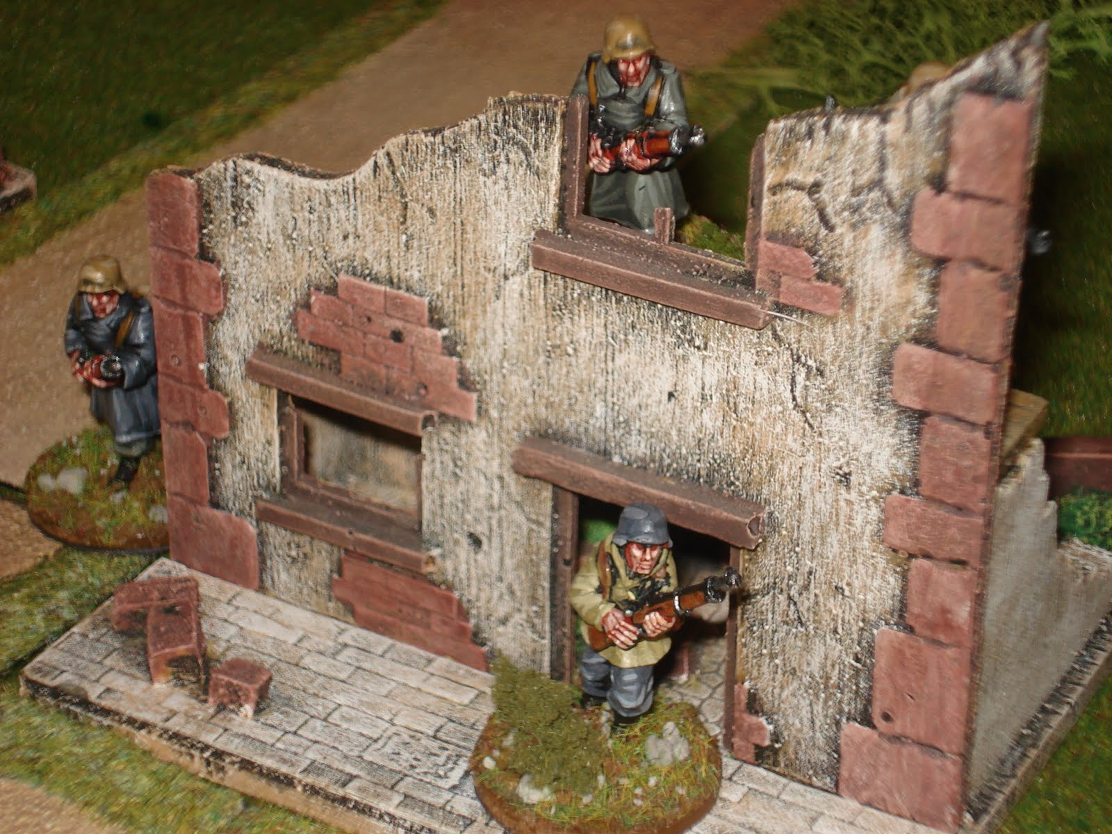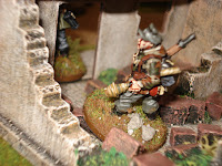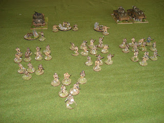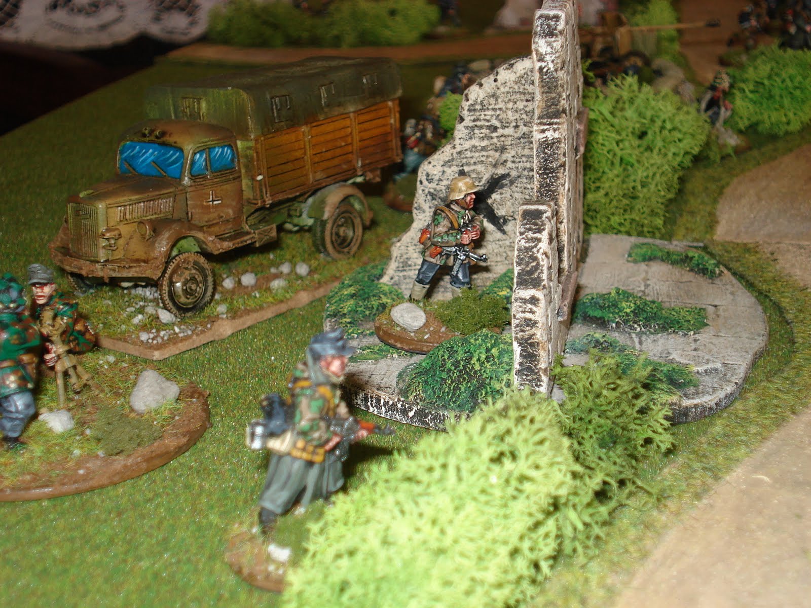 Sur l'aile gauche, en position avancée, un squad de grenadiers est déployé autour et à l'intérieur du premier bâtiment, tandis qu'en retrait se trouve la MG42 derrière des buissons et l'équipe de snipers, embusquée dans le bâtiment du carrefour.