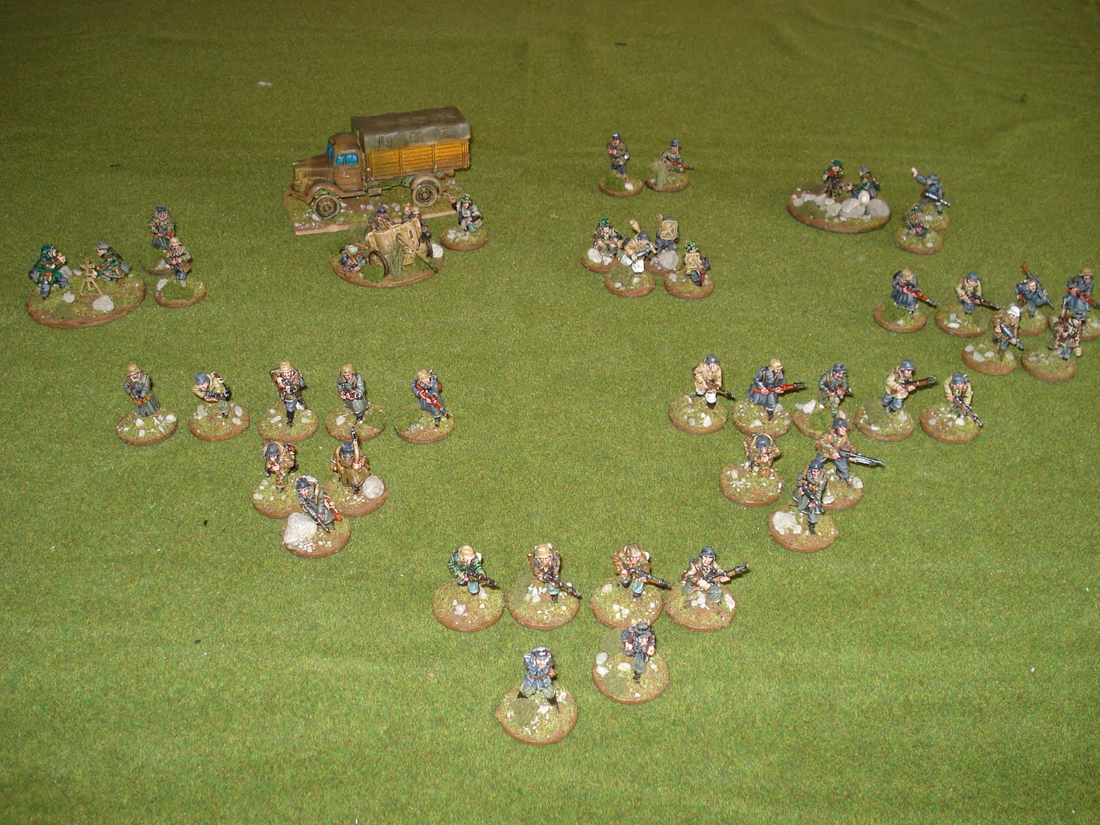 Du côté allemand, la section est dirigée par un squad de commandement et comporte trois squads de combat et trois groupes de support dont, une mitrailleuse lourdre MG42, un groupe de casseurs de chars (de quatre hommes équipés de panzerschreck et panzerfaust), un mortier de 80mm et une équipe de snipers. L'ensemble est soutenu par un canon antichar (pak 38) tracté par un camion opel blitz.