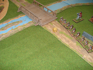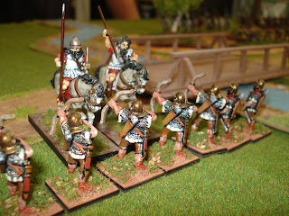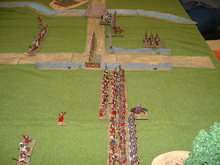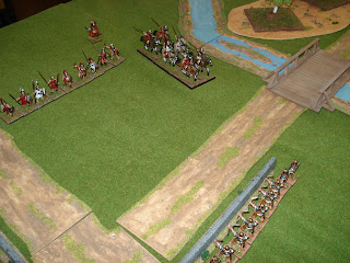 Sur l'aile gauche, Jean-Louis entamait également un mouvement frontal très agressif, tout en essayant d'envelopper notre aile avec une unité de vacalerie légre armée d'arcs courts. J'ai cru pouvoir contrer cette approche réalisée contre les troupes de mon général en chef, par une manoeuvre (perfide comme la qualifiera mon adversaire Jean-Louis) latérale, en envoyant une unité de peltastes grecs franchier le cours d'eau par un gué qui avait été signalé en début de partie. Je me frottai déjà les mains à l'idée d'approcher le flanc des cohortes romaines.