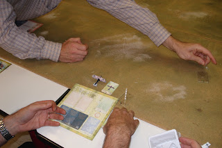 Les hositilités se sont engagées avec beaucoup de détermination de part et d'autre de la table de jeu, de sorte que l'ambiance est montée d'un cran dès le tour 2. Il faut dire que du côté allemand, avec mon albatros DIII, j'entrai en collision avec mon ailier Gilles aux commandes de son biplace, quand du côté allié, Joseph se faisait malmener par son ailier, Pierre, quelque peu maladroit dans sa manoeuvre. Agacé, Joseph lui aurait volontiers tordu le coup, comme vous pouvez le constater ci-après ; heureusement, l'amitié a pris le dessus ;-)