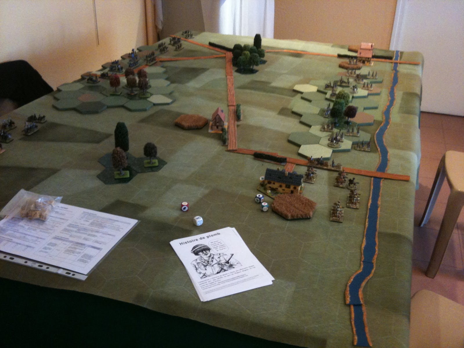 Une fois revenu sur les lieux de la bataille, j'ai pu constater que les Français avaient très fortement bousculé le camp prussien, aussi bien sur l'aile droite depuis la fin de la matinée, qu'au centre, par la progression de l'infanterie française au son du canon. Sur l'aile gauche, Jean-Jacques avait pris le dessus grâce à ses troupes fraîches, face à Tristan (10 ans !) qui s'était défendu comme un petit diable, soutenu par son père, bien connu des joueurs Histoire de plomb pour sa ténacité sur le champ de bataille.