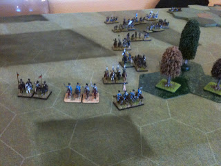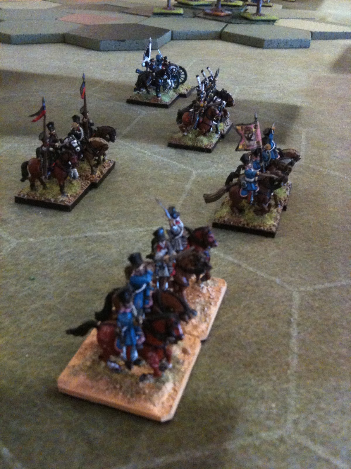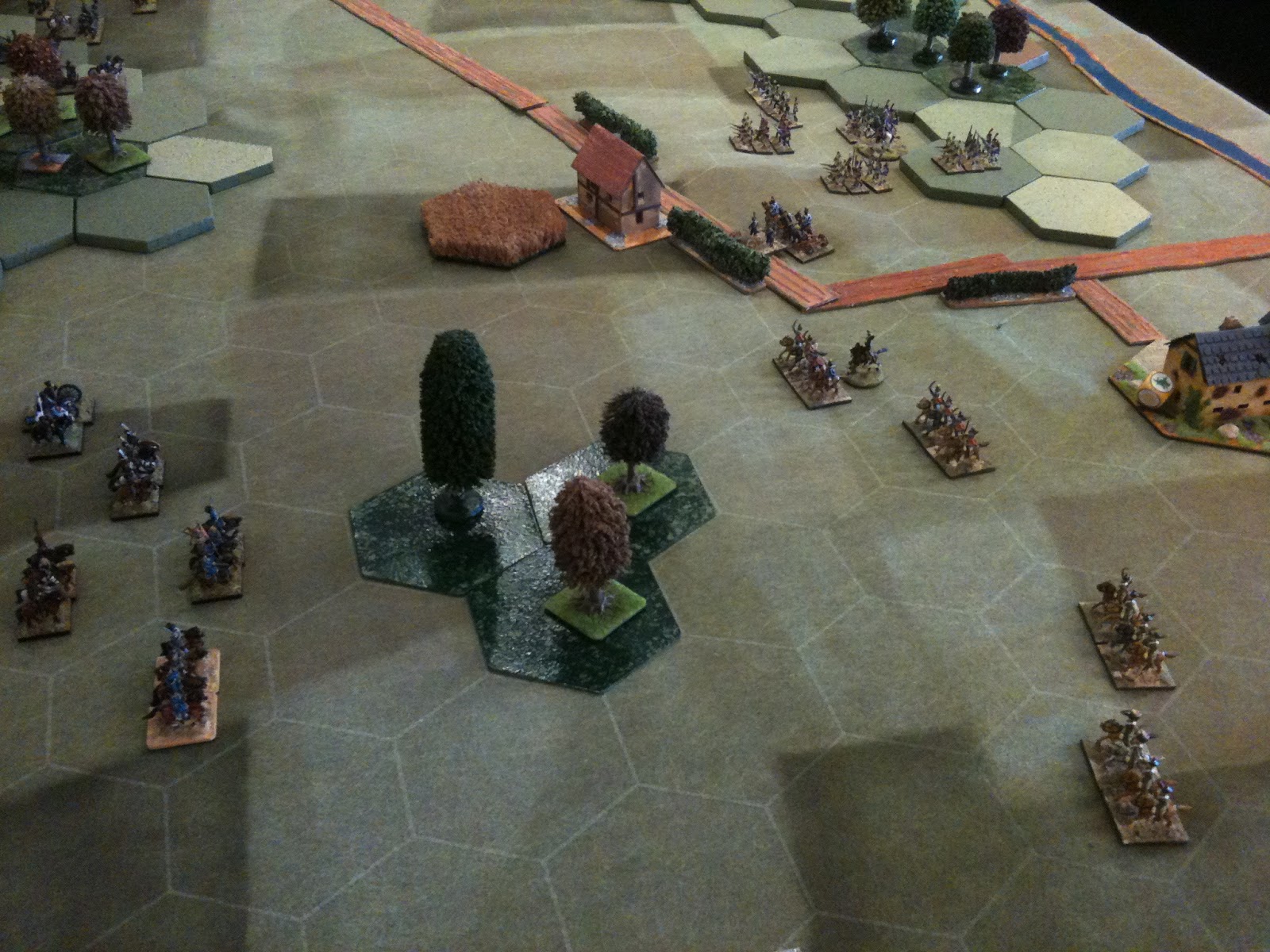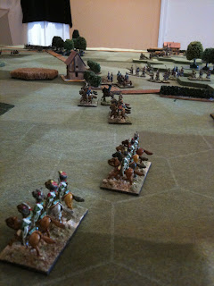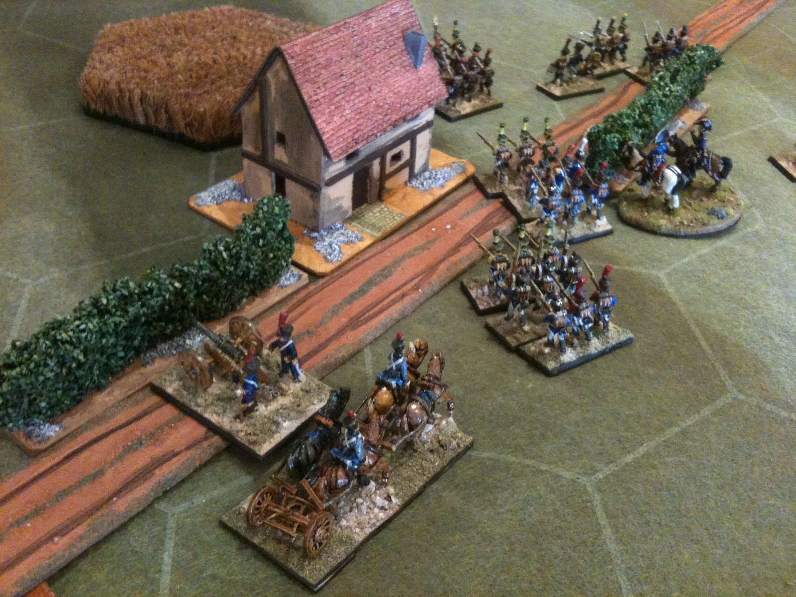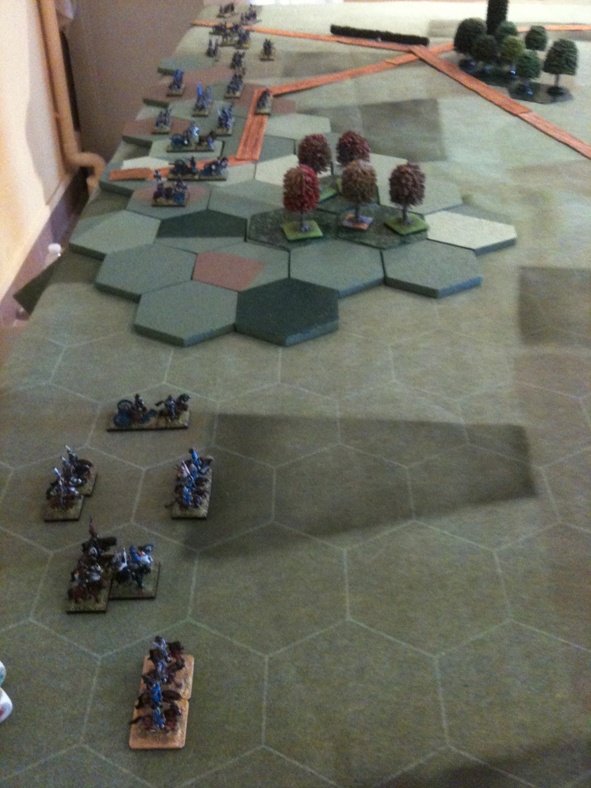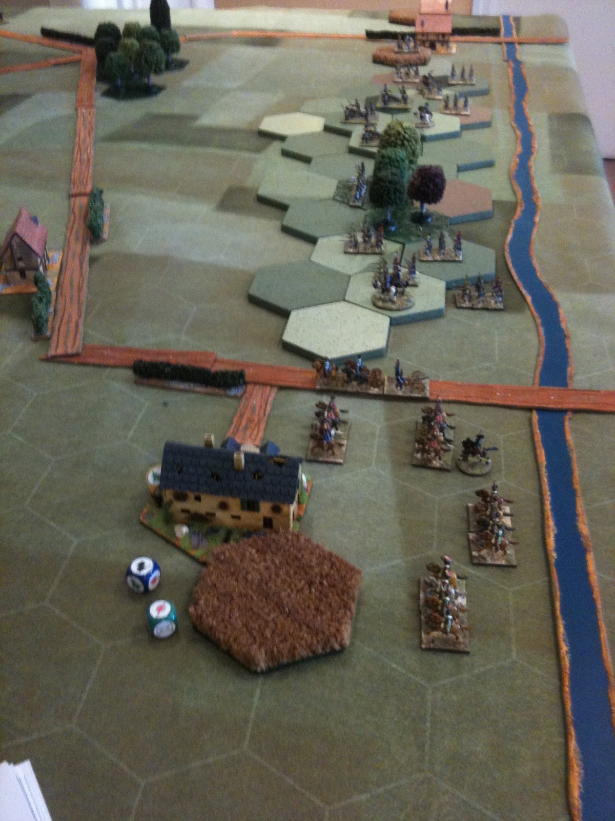 A la manoeuvre et jusqu'à l'arrivée des renforts dotés d'une division d'infanterie et d'une division de cavalerie de ligne, le français pouvait compter sur trois divisions d'infanterie, déployées sur le plateau et d'une division de cavalerie légère, couvrant l'aile gauche française. Je dois vous préciser que j'ai joué cette division de cavalerie légèe toute la matinée, en perdant une bonne partie de ses effectifs pour retarder la progression prussienne.
