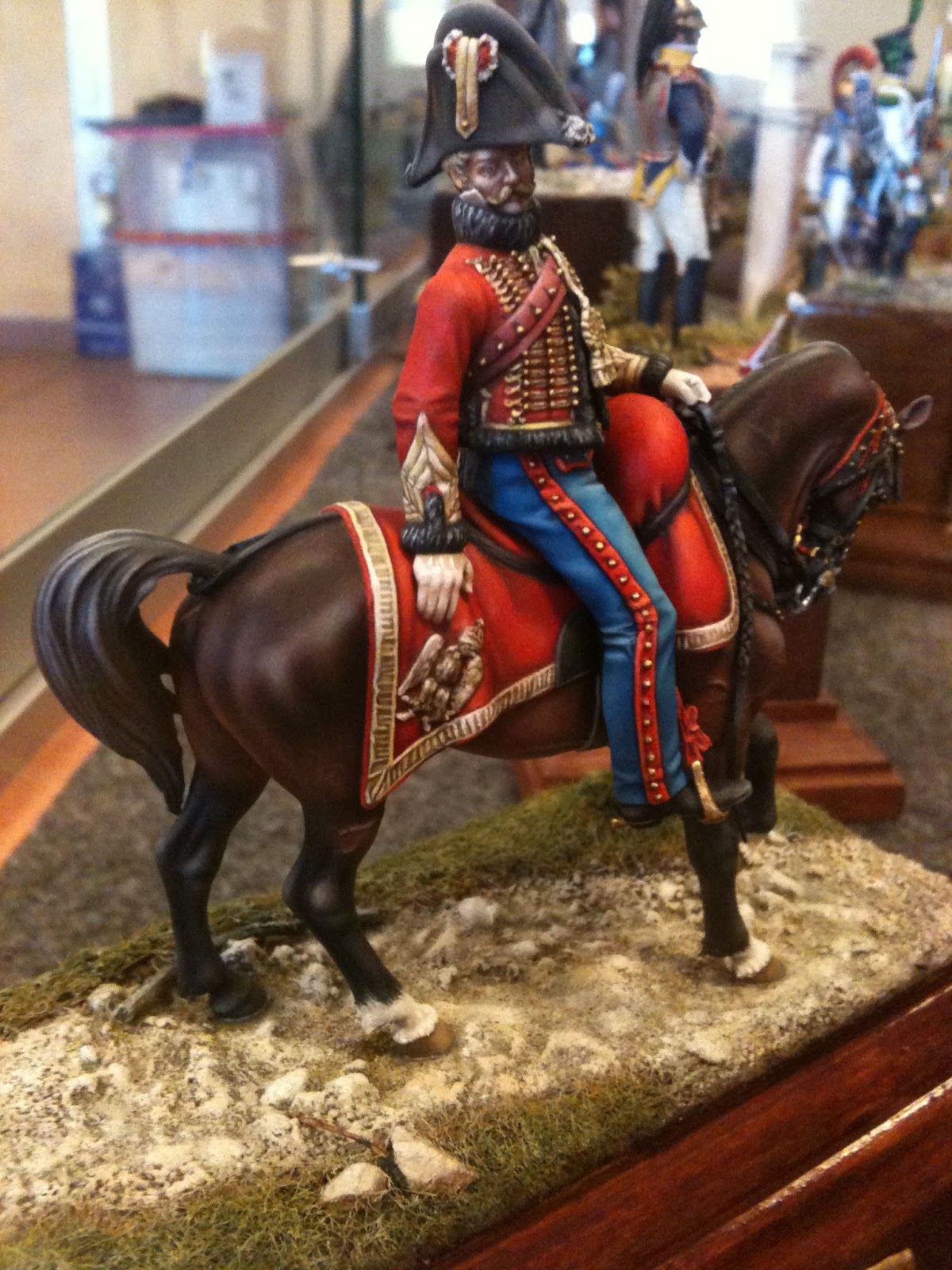 Je me dois de préciser au lecteur que Jean-Jacques est un grand spécialiste de la période impériale (il vient de signer un article sur les marins de la Garde dans la revue "soldats napoléoniens". Il se mettra ainsi, très rapidement, dans son rôle de général, fort de ses acquis historiques sur la période. Qui plus est, Philippe, sur le stand de peinture, endossant le rôle de l'Empereur veillant à distance sur l'évolution de la bataille, remarquera les aptitudes tactiques de son officier engagé dans les combats. Il lui fera parvenir une billet par le biais d'un aide de camp, l'encourageant dans sa progression et le couvrant de tous honneurs (à la condition de ne pas avoir à délier sa bourse ;-)