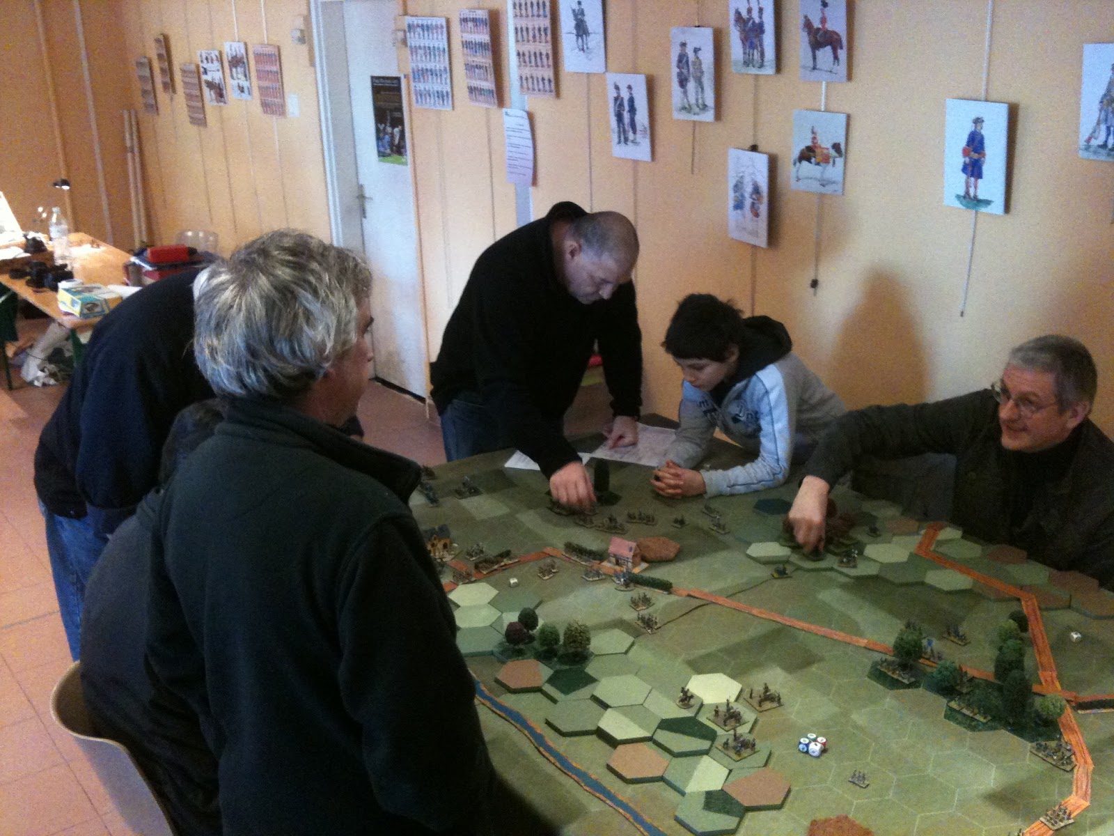 Bref, après avoir apprécié le doux soleil de janvier, n'oubliez pas que nous sommes à Nice et qu'il y fait bon toute l'année ou presque, nous somme retournés sur les lieux de l'exposition afin de briefer nos participants. Du côté prussien, Jean-Louis devait mener l'offensive, renforcé par Alain et Tristan à partir de 14H00. Du côté français, Stéphane devait tenir le terrain, soutenu par Jean-Jacques à partir de 14H30. Pour ma part, j'allais, surtout donner des conseils à nos joueurs de Tactique les moins aguerris tout en renseignant les spectateurs intéressés.