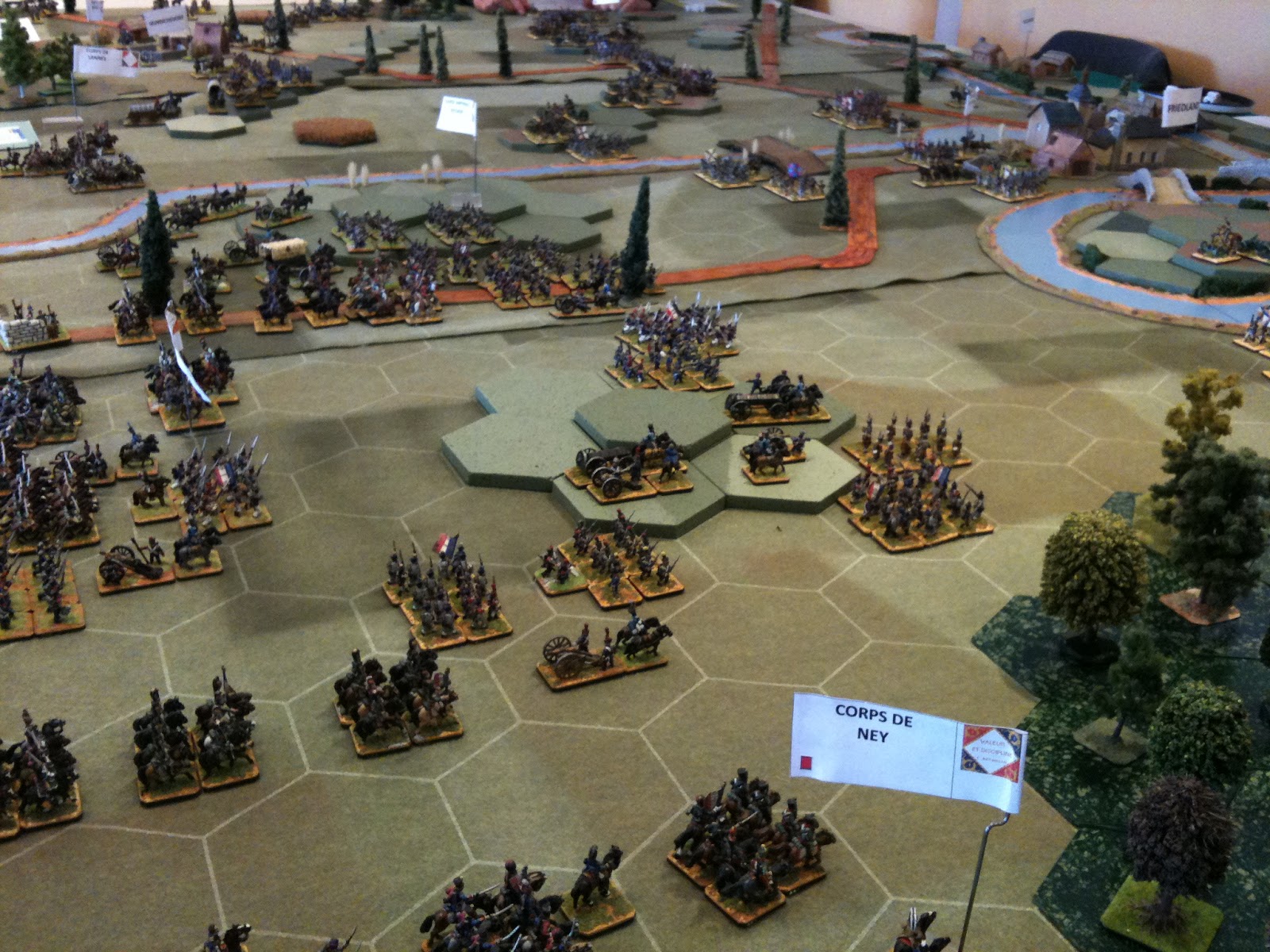 Bref, même si je m'égare peut-être un peu quant à la puissance psychologique de nos fanfares sur le moral de l'ennemi, ce dont je suis certain, c'est qu'elle a donné du baume au coeur à nos troupes, celles-ci devant monter à l'assaut du village de Friedland face aux solides positions défensives de l'armée russe, comportant, notamment, plusieurs batteries de position au feu dévastateur. La musique eut un effet si entraînant sur mes troupes situées à l'aile gauche (je jouais, en effet, le Maréchal Mortier), qu'elles débutèrent la bataille "sus à l'ennemi".