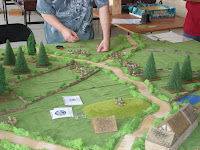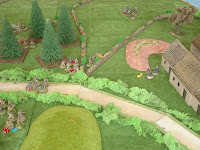 La table de 1,80m par 2,40m représente la zone de ces combats du 6 juin 1944, à l'échelle du 28mm.