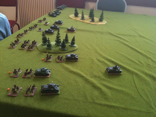 Afin de mener l'assaut, les russes disposaient d'une compagnie bindée de la Garde, essentiellement composée de T34/85, accompagnée d'une compagnie d'infanterie. Le tout était soutenu par de l'artillerie hors carte (une batterie de mortiers lourds de 120mm) et de l'artillerie sur table (un peloton de KV2, survivance du début de la guerre). Ceux-ci seront d'ailleurs soumis à une carte "Breakdown", symbolisant les pannes récurrentes de ces mastodontes au canon de 152mm.