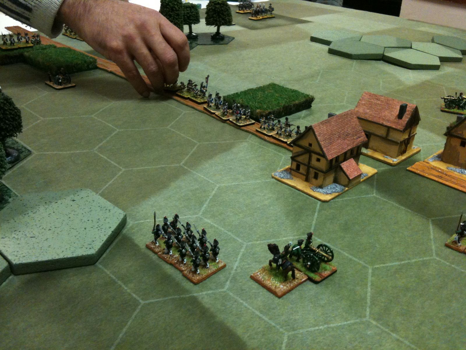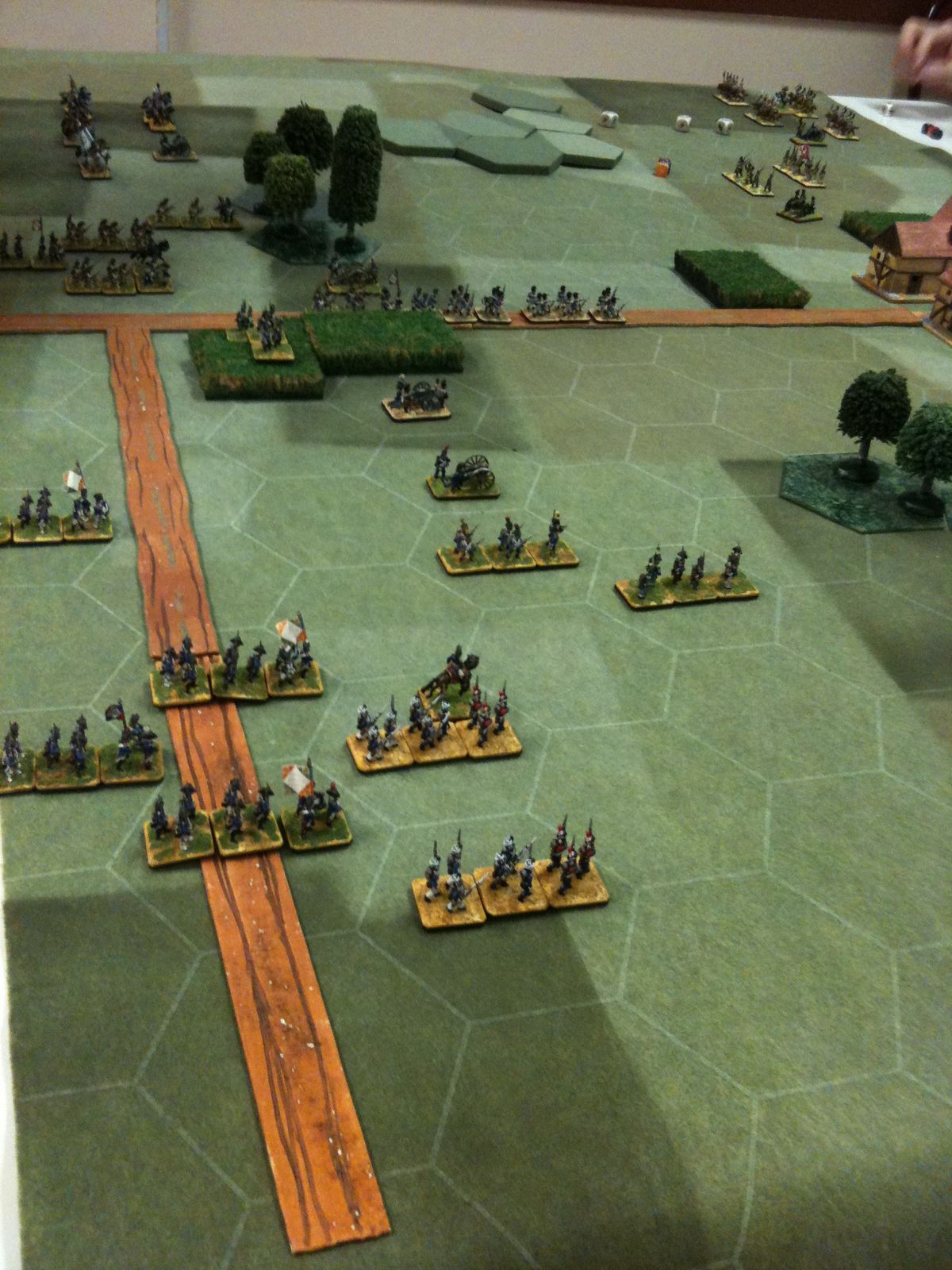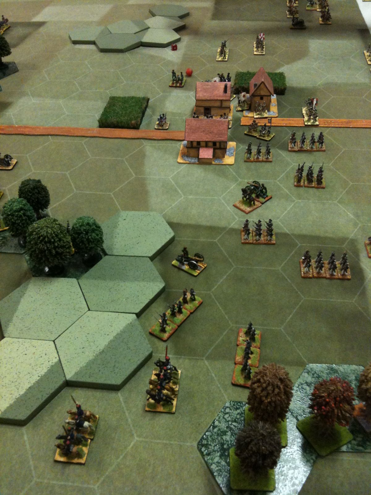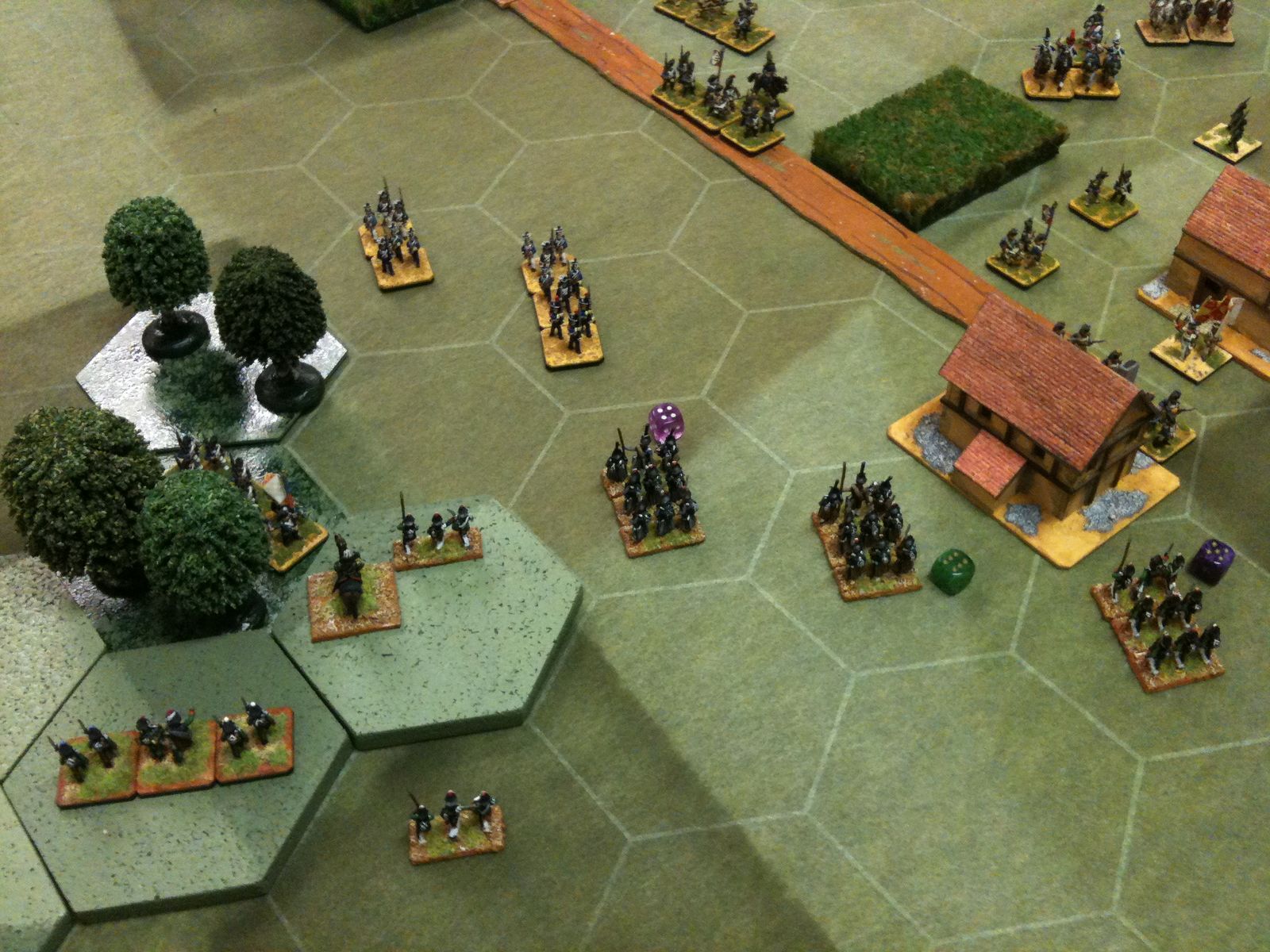 Dès le tour 1, je suis monté à l'assaut du village, unique objectif tactique de ce scénario. Pour ce faire, j'ai fait avancer mes régiments d'infanterie en colonne, au pas accéléré, sur la grand route, tout en protégeant leur progression par une manoeuvre de cavalerie sur mon aile gauche. D'ailleurs, grâce à ma cavalerie, j'ai fait des ravages dans les rangs russes et Jean-Louis n'en menait pas large.