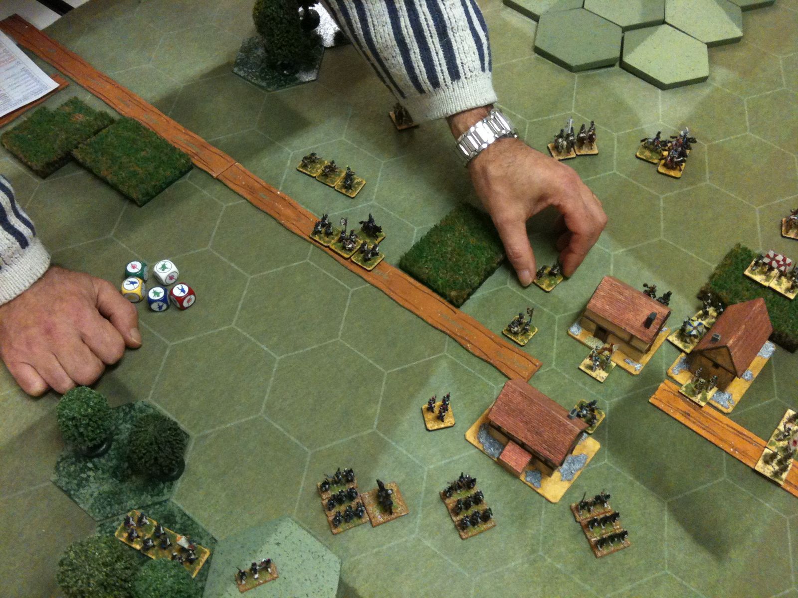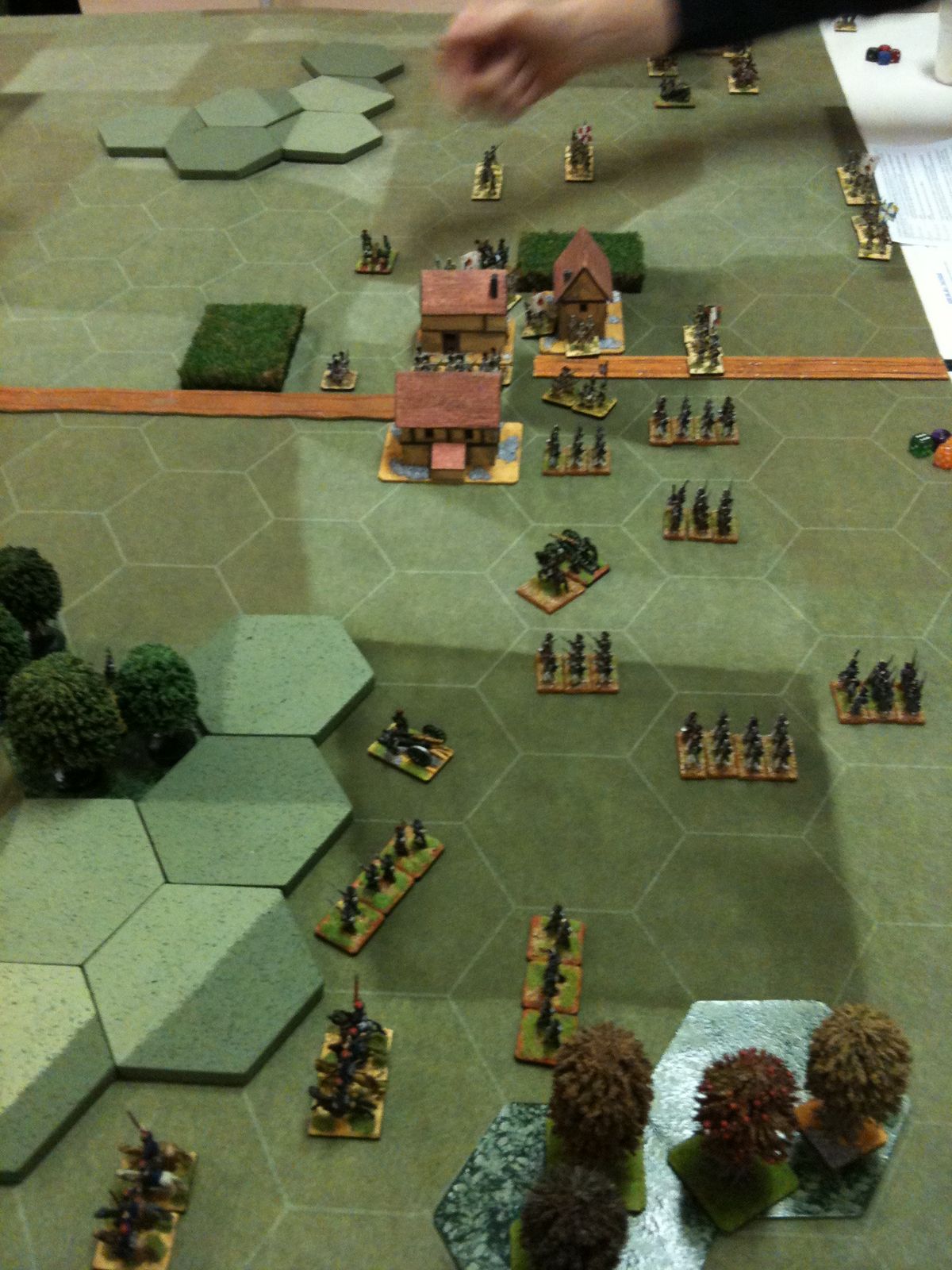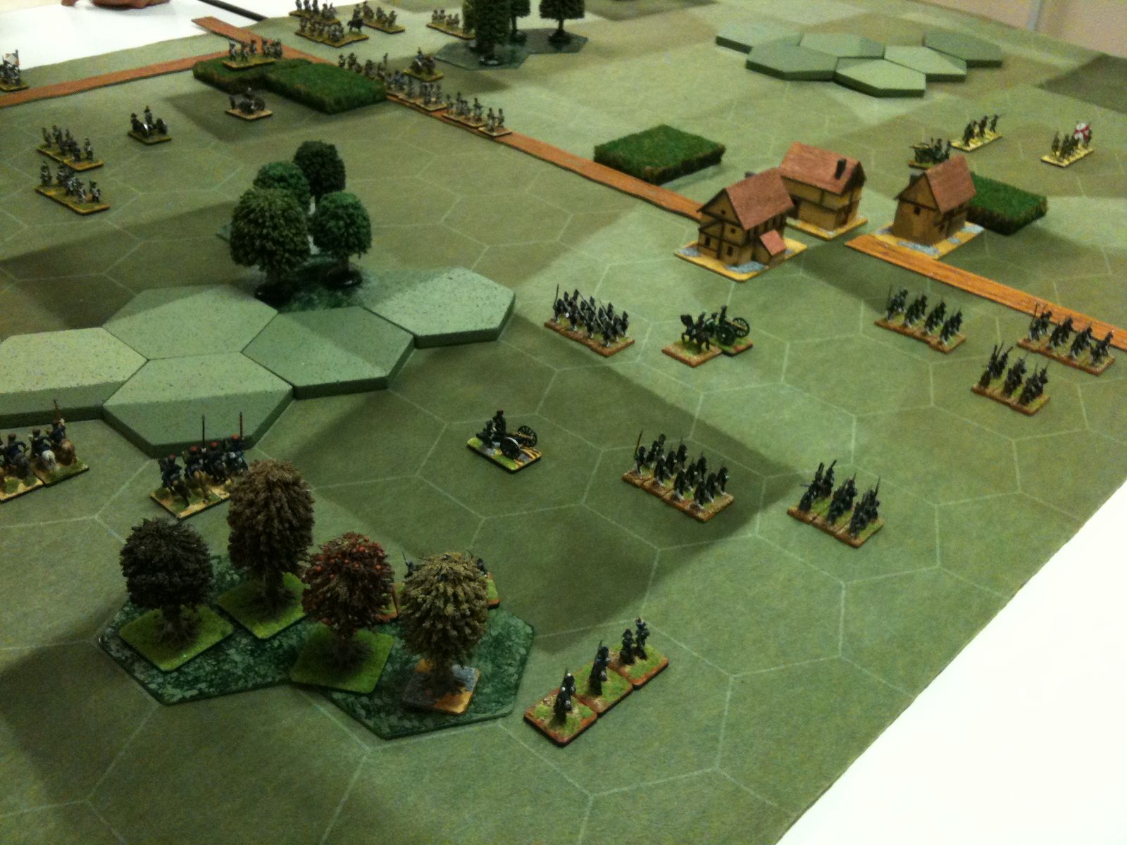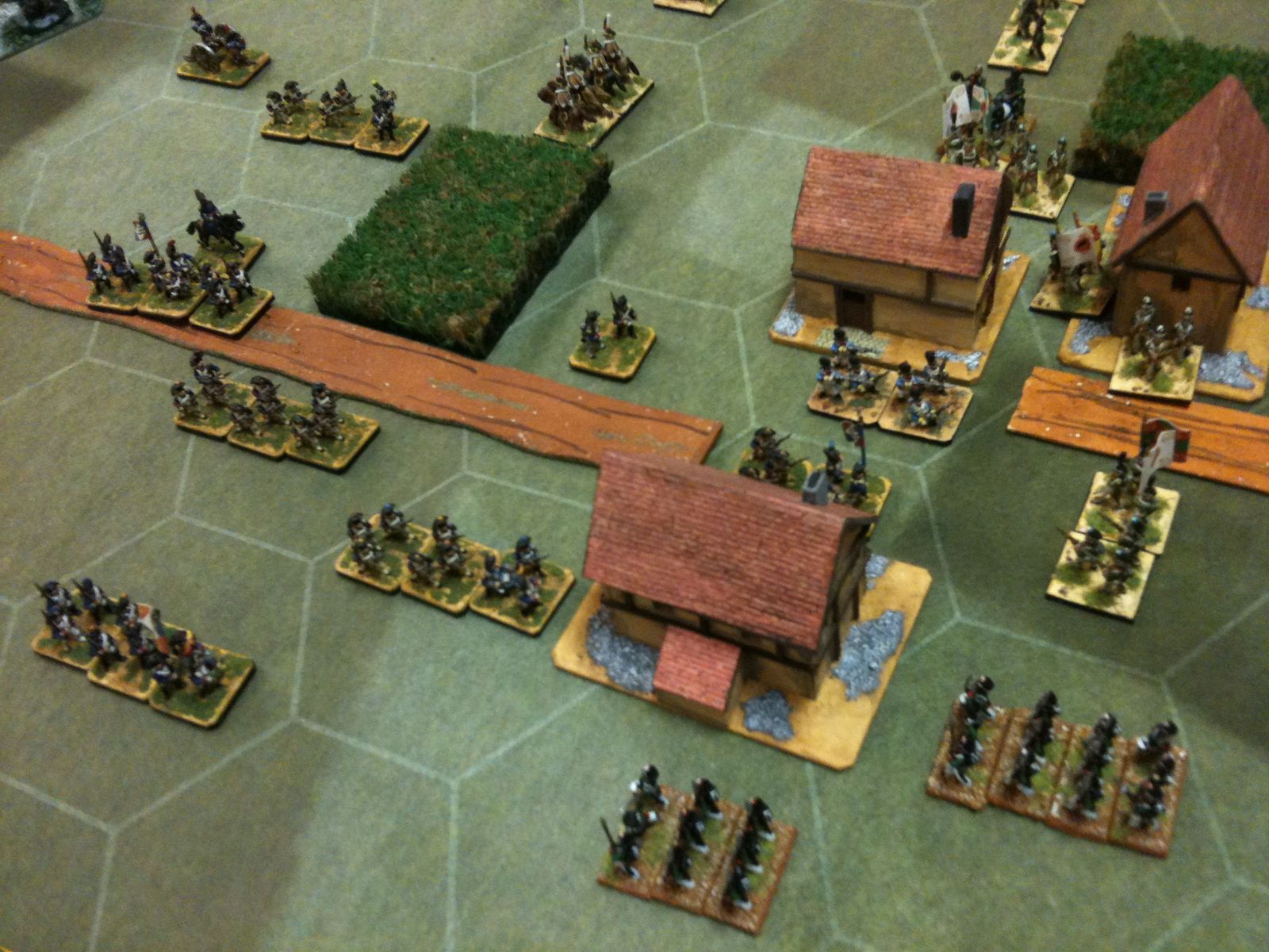 Dès le tour 1, je suis monté à l'assaut du village, unique objectif tactique de ce scénario. Pour ce faire, j'ai fait avancer mes régiments d'infanterie en colonne, au pas accéléré, sur la grand route, tout en protégeant leur progression par une manoeuvre de cavalerie sur mon aile gauche. D'ailleurs, grâce à ma cavalerie, j'ai fait des ravages dans les rangs russes et Jean-Louis n'en menait pas large.