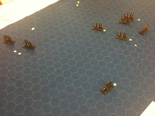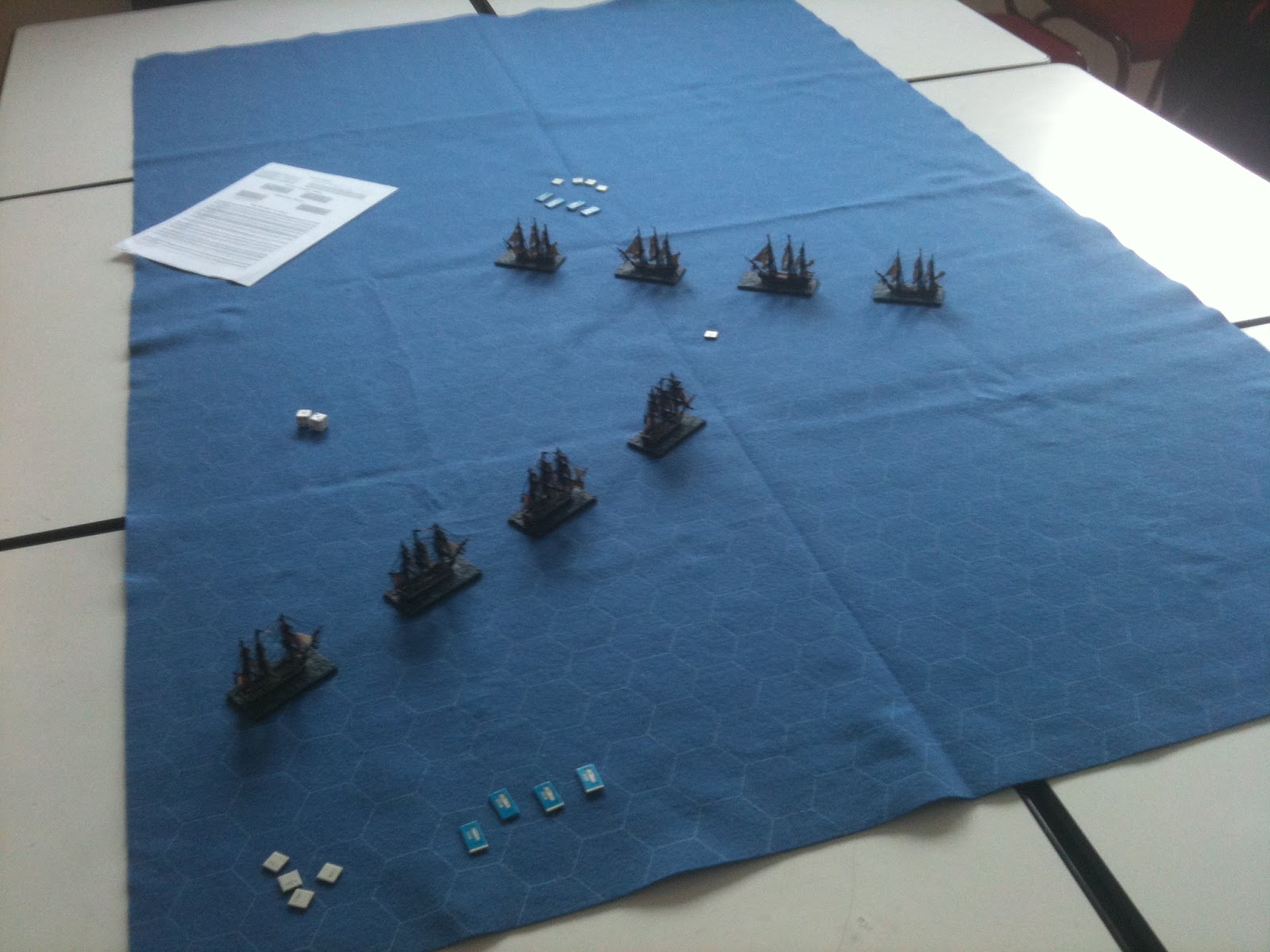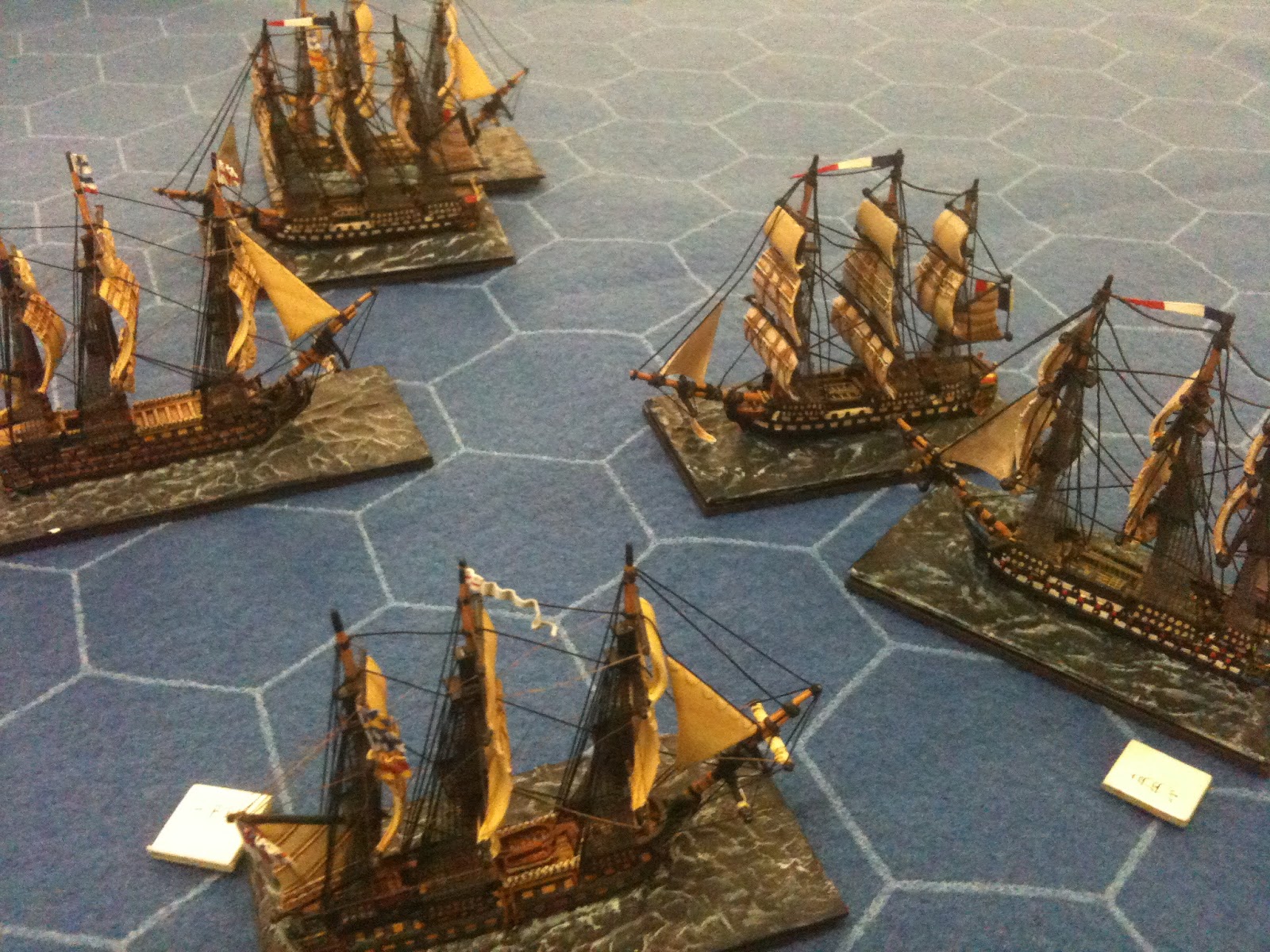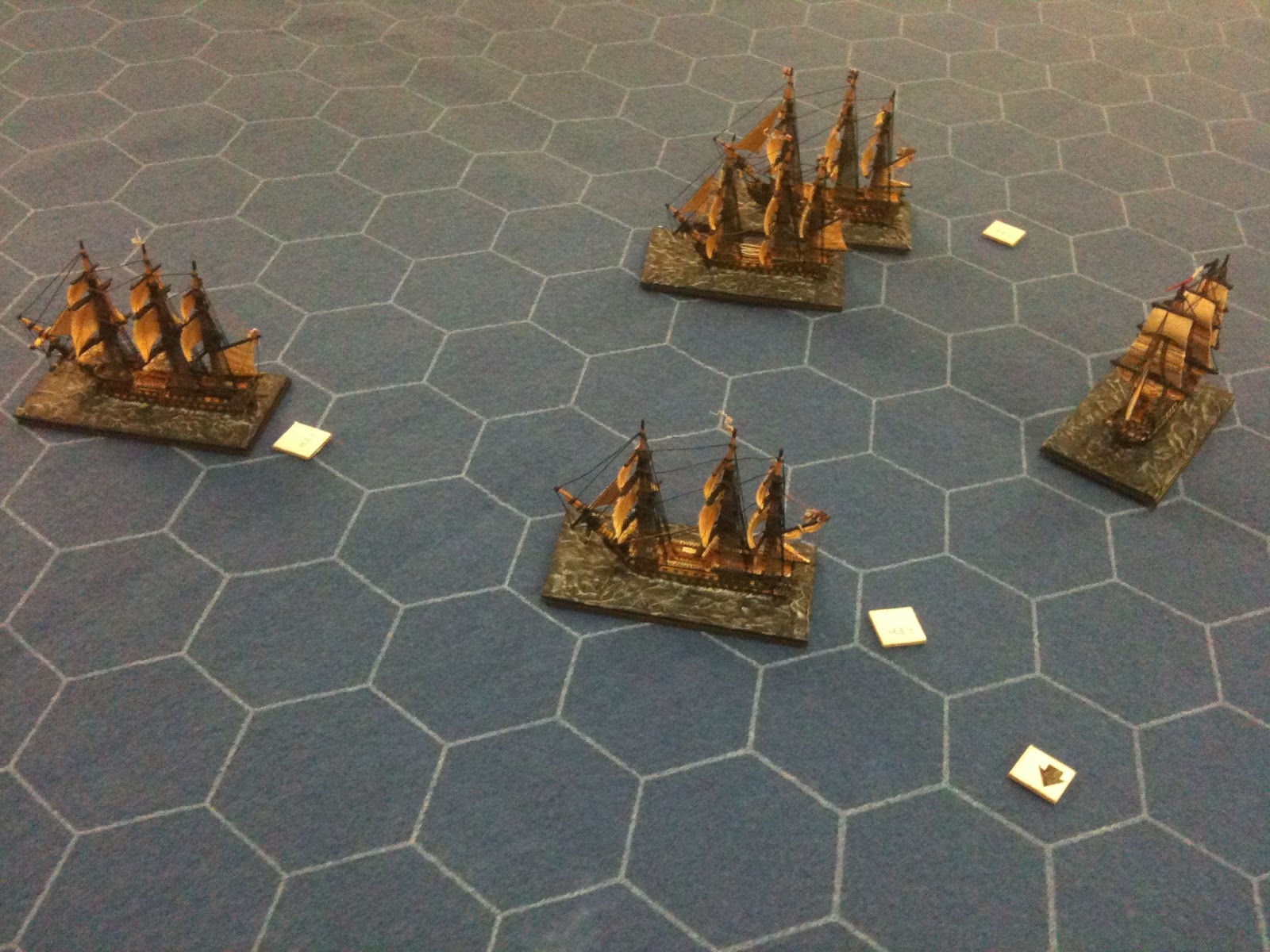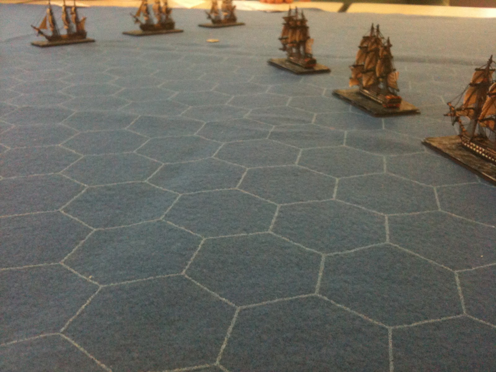 Dès 19H00, tous les navires étaient disposés sur la nappe de jeu hexagonée Hotzmats et il ne manquait plus que nos quatre marins d'eau douce pour diriger l'ensemble.