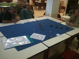 Ce vendredi, 1er avril 2011, un quatuor de joueurs s'était donné rendez-vous dans les locaux de l'association Histoire de plomb pour disputer une partie de Wooden ships iron men (WSIM) avec des figurines de navires Langton à l'échelle du 1/1200. A notre arrivée, Jean-Louis et Claude s'étripaient déjà joyeusement (dans nos locaux, vous pouvez installer votre table de jeu dès 17h00), autour d'une table de Blitzkrieg Commander II (BKC), avec des figurines GHQ à l'échelle du 1/300, sous les yeux fascinés de Maurinator, de passage au club.